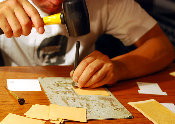 こちらは、いわゆる目打ちですね。縫い穴を開けていっております。
