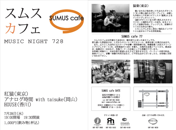 フライヤーのとおり、7月28日(水)、「SUMUS cafe(スムスカフェ)」にて「MUSIC NIGHT 728」というイベントです。