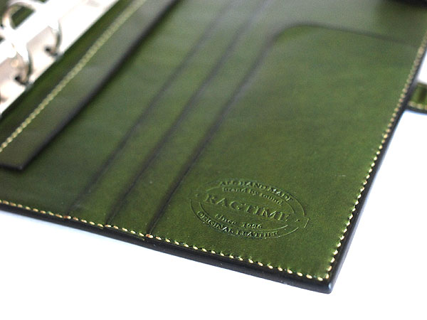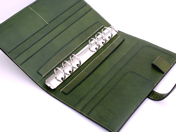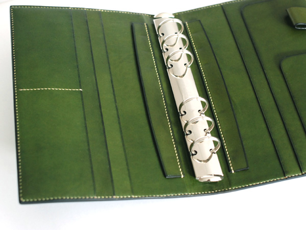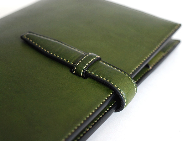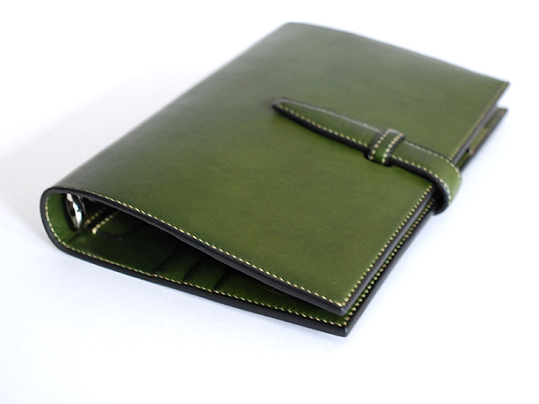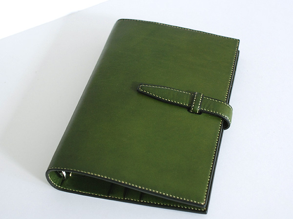 しっとりとした肌触りと、劇的な経年変化が楽しめるイタリア産の皮革、ミネルバ・リスシオ(オリーブ)を使用した、バイブルサイズ(171×95mm)のシステム手帳です。