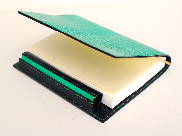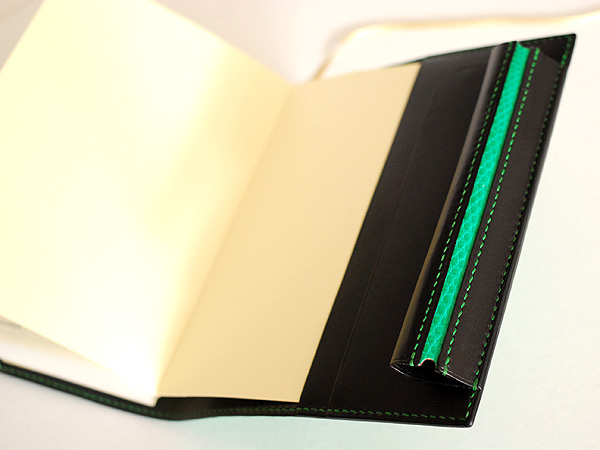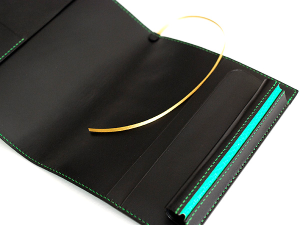 外側にリングリザード革(ターコイズ)、内革にブッテーロのブラックを使用し、縫い糸もターコイズ。しおり紐はゴールドを使用しております。かなりゴージャスですね~。