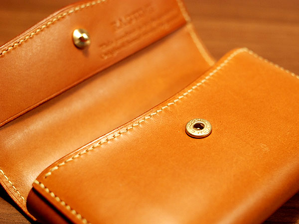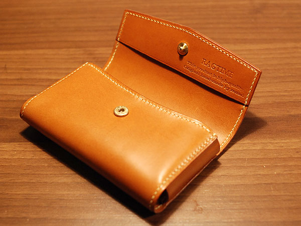 先日ご紹介したキーケース同様、至ってシンプルですがRAGTIMEで多く用いるフラップの形状となっております。皮革はブッテーロのキャメル使用。