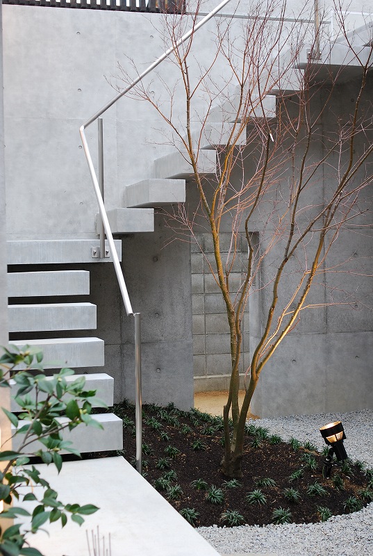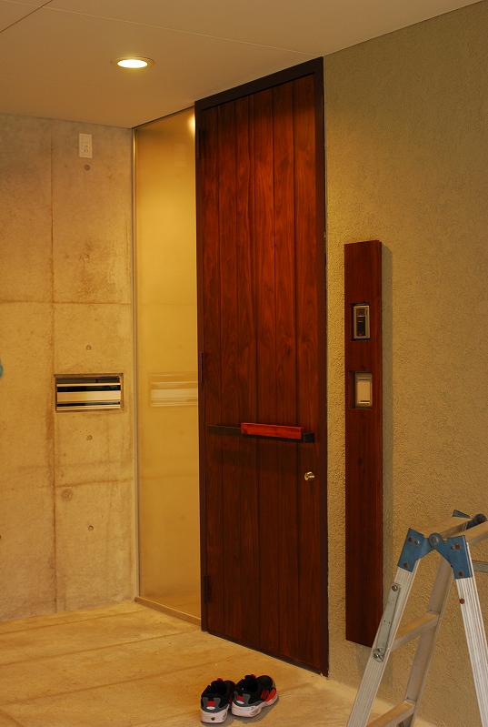 左は玄関です。当店のテーブルなどを製作した某家具屋さんによるウォールナットの玄関ドア’&インターホン。もちろん設計士さんがデザインした一点ものです。右は中庭です。