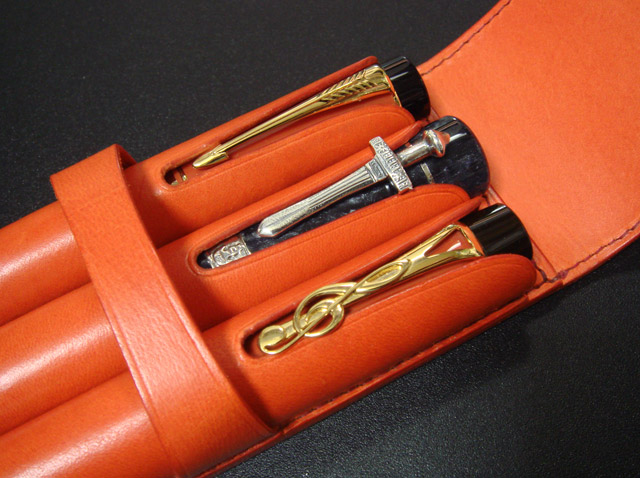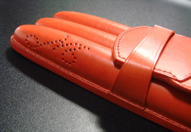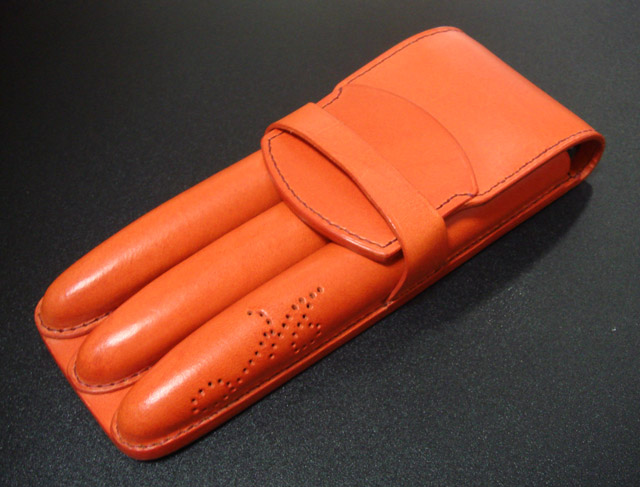 木型の直径が15mmと18mmの2種類どちらかを使用し、革の種類や色、縫い糸の色、クリップ部分の仕様などを選択して頂けるセミオーダーと、お客様お手持ちの万年筆のサイズに合わせて木型から製作するフルオーダーでの製作が可能です。セミオーダー3本差しの万年筆ケースで3万円~製作できます。