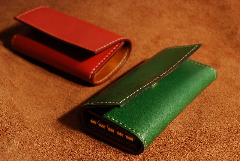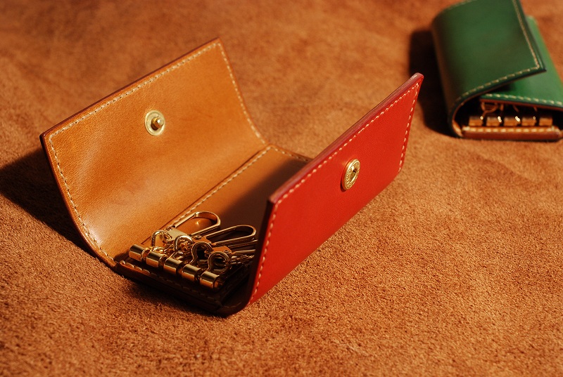 形状はオーソドックスなキーケースなのですが、使用する革の色で自己主張。レッドの方はブッテーロのレッドではなく、落ち着きとエレガントさを出す為にバッファローのレッドを採用してみました。