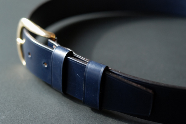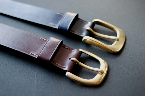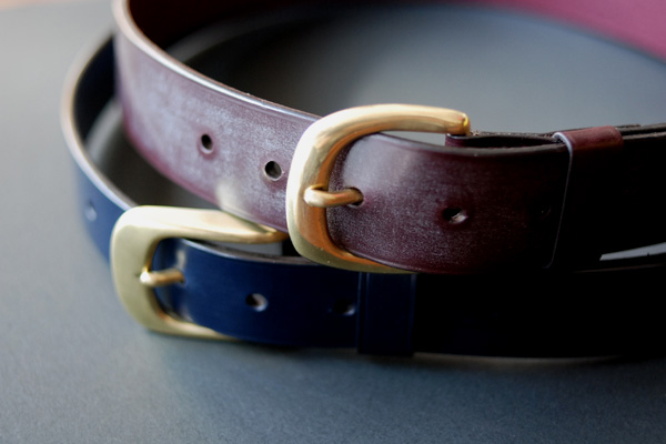 J&Eセジュイック社のブライドルレザーを元の厚さ(約3.5mm)のまま使用したベルトで、色はボルドーとネイビーです。
