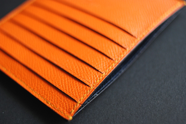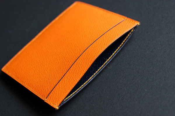 表革にノブレッサのオレンジを、裏革にネイビー、縫糸はオレンジに染めた麻糸を用い、手縫いにて仕立てております。