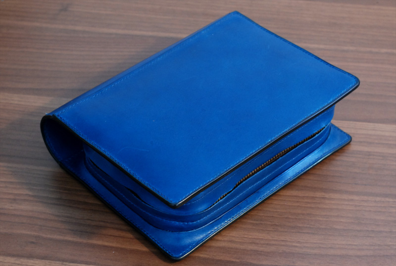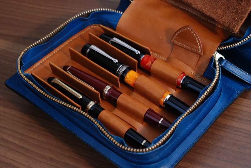 今回の万年筆ケースは、外革にブッテーロのブルー、内革にブッテーロのキャメルを使用し、コバは焦げ茶の染料で着色し仕上げています。